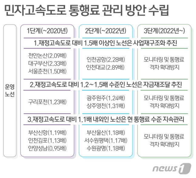 ±¹ÅäºÎ¿Í ±âȹÀçÁ¤ºÎ´Â ¹ÎÀÚ°í¼Óµµ·ÎÀÇ °ø°ø¼º °È¸¦ À§ÇÑ '¹ÎÀÚ°í¼Óµµ·Î ÅëÇà·á °ü¸® ·Îµå¸Ê'À» Áö³ 8¿ù¿¡ ¼ö¸³Çß´Ù. ÇöÀç ¿î¿µ ÁßÀÎ 18°³ÀÇ ¹ÎÀÚ°í¼Óµµ·ÎÀÇ Æò±Õ ÅëÇà·á´Â ÀçÁ¤ °í¼Óµµ·Î ´ëºñ 1.43¹è ¼öÁØÀ¸·Î ±¹¹ÎÀÇ ÅëÇà·á ºÎ´ãÀ» °¡Áß½Ã۰í ÀÖ´Ù°í ÆÇ´ÜÇÑ °ÍÀÌ´Ù.