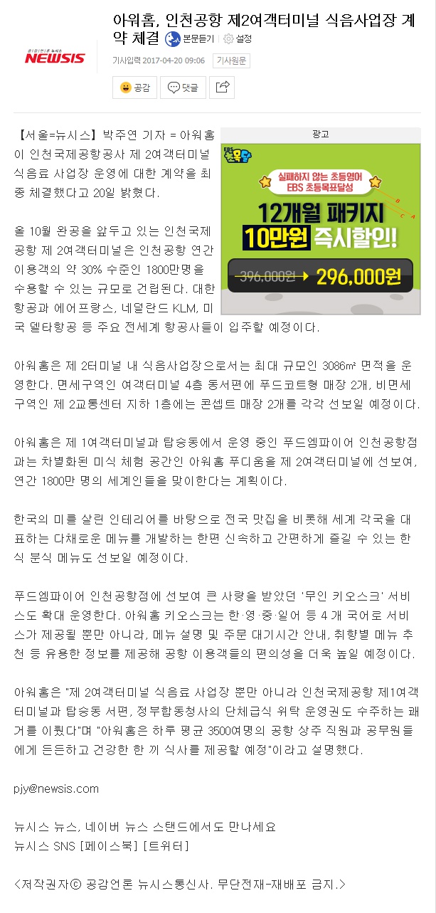 ¾Æ¿öȨ, ÀÎõ°øÇ× Á¦2¿©°´Å͹̳Π½ÄÀ½»ç¾÷Àå °è¾à ü°á